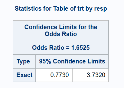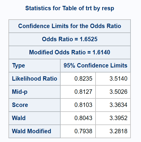 table trt*resp /or(CL=(wald waldmodified lr score midp));