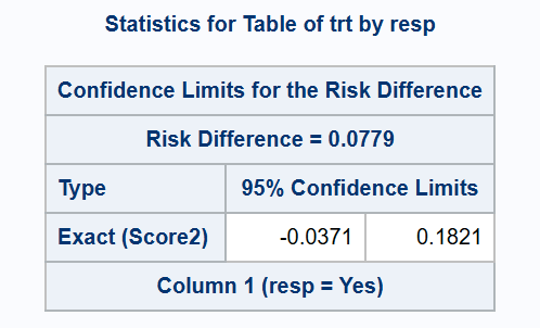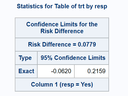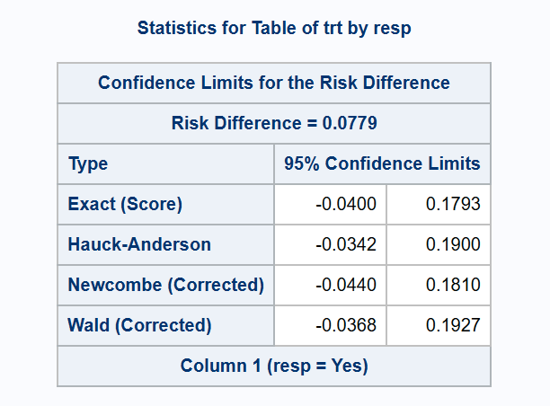table trt*resp/riskdiff(CL=(exact ha wald(correct) newcombe(correct)) norisks);
