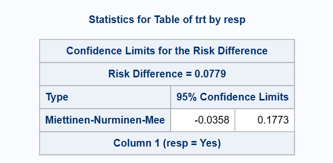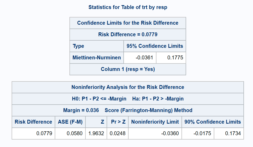 table trt*resp / riskdiff(CL=mn noninf margin=0.036 method=score);