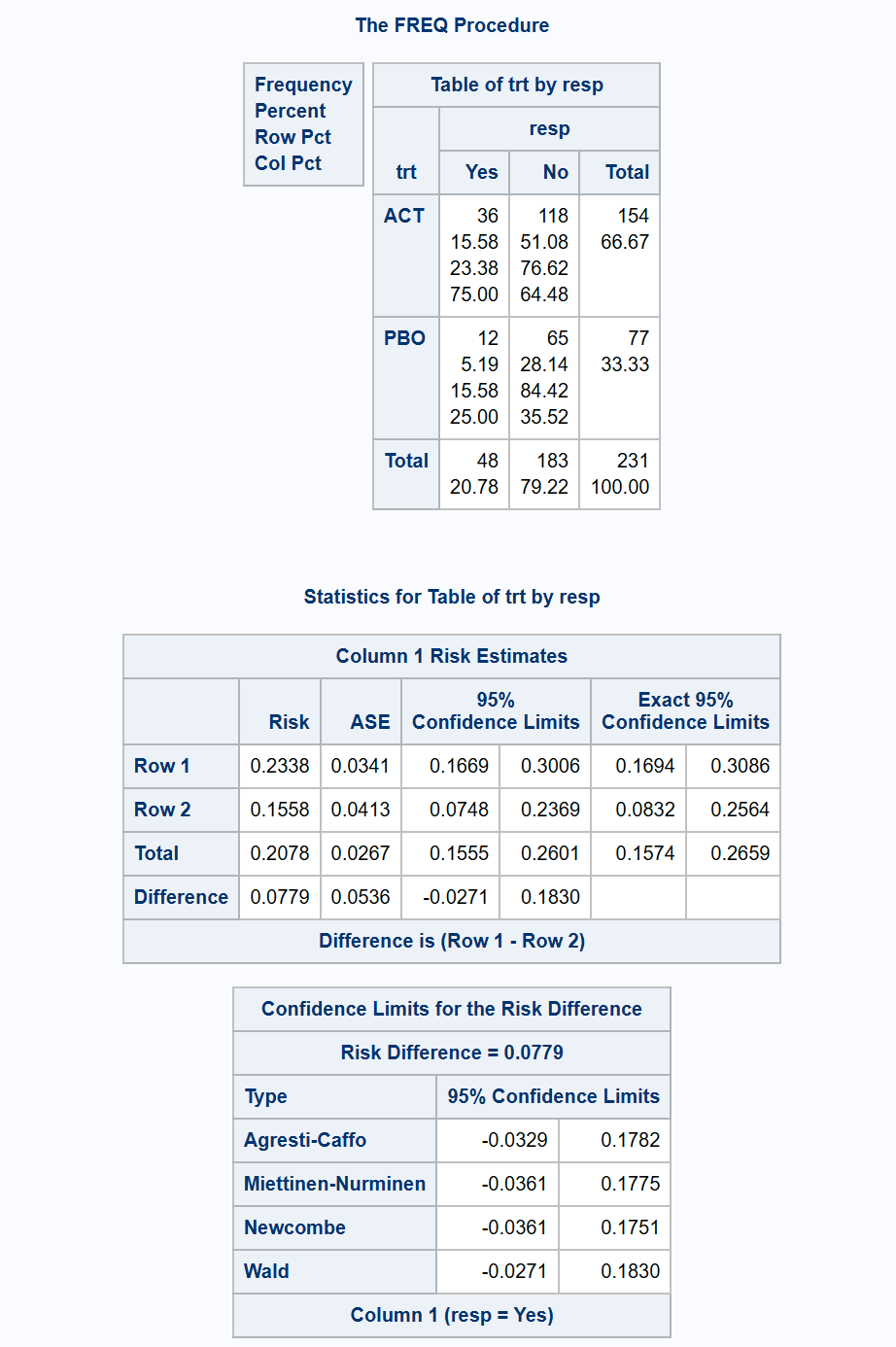 run; The below shows that for the Active Treatment, there are 36 responders out of 154 subjects, p1 = 0.2338 (23.38% responders), while for the placebo treatment p2 = 12/77 = 0.1558, giving a risk difference of 0.0779, relative risk 1.50, and odds ratio 1.6525.