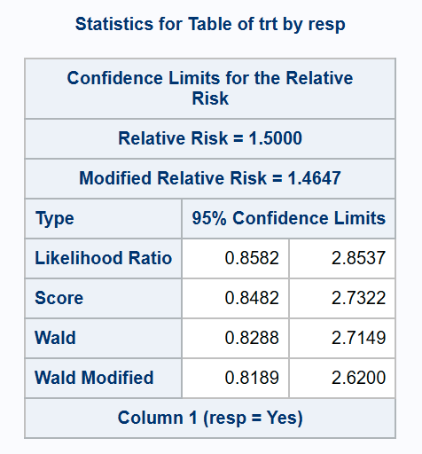 table trt*resp /relrisk(CL=(wald waldmodified lr score));
