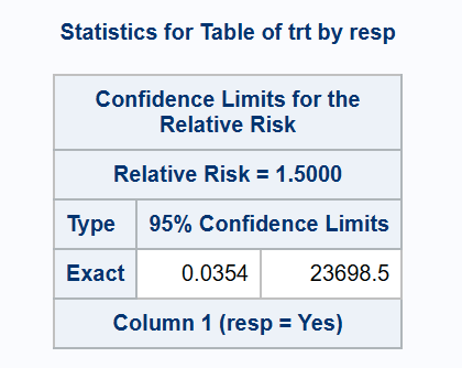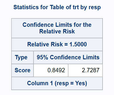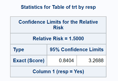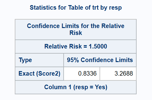 table trt*resp /relrisk(CL=(score(correct=no)));