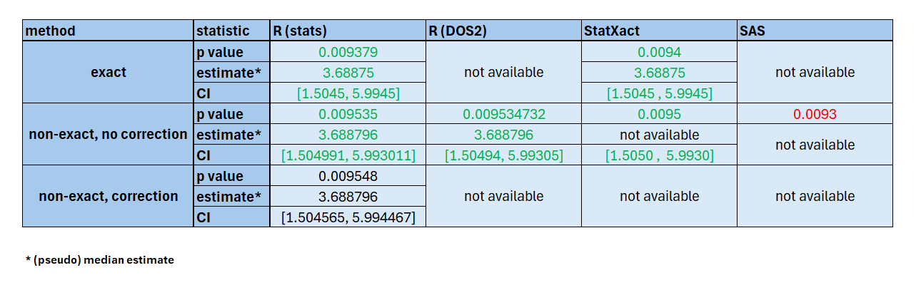 | Hodges-Lehmann estimator | YES | NO | YES | Available in R and StatXact only. In SAS needs to be derived manually. |