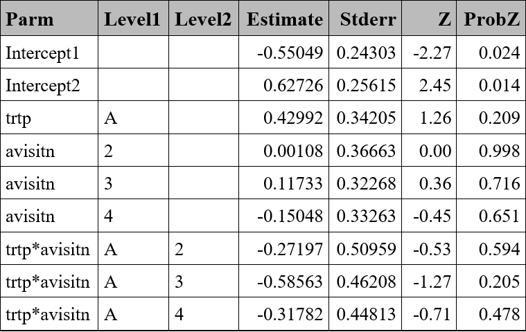 trtpA:avisitn2 -0.27197 0.50959 -0.5337 0.59355