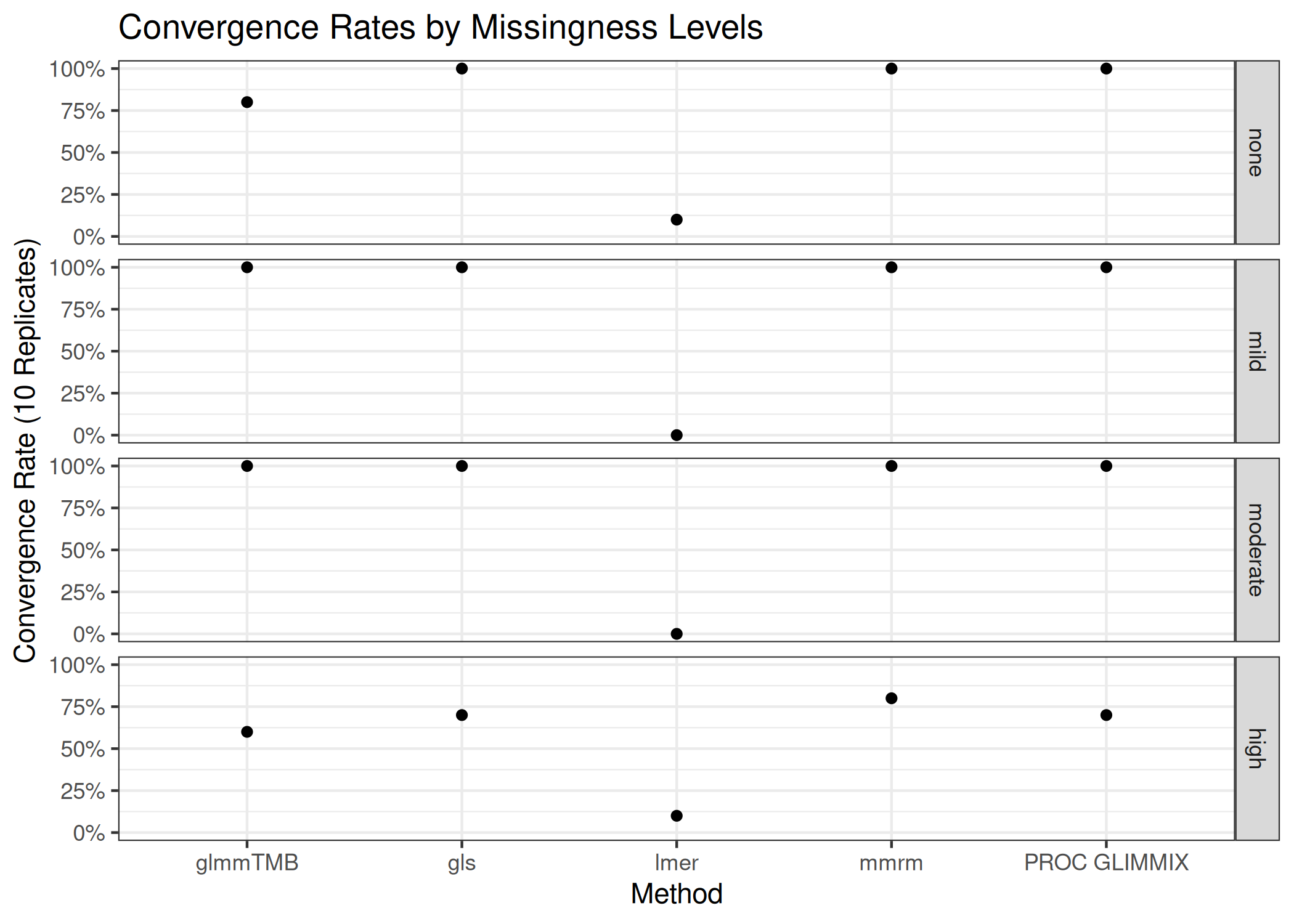 mmrm, gls, and PROC GLIMMIX are resilient to missingness, only exhibiting some convergence problems in the scenarios with the most missingness. These implementations converged in all the other scenarios’ replicates. glmmTMB, on the other hand, has convergence issues in the no-, mild-, and high-missingness datasets, with the worst convergence rate occurring in the datasets with the most dropout. Finally, lmer is unreliable in all scenarios, suggesting that it’s convergence issues stem from something other than the missing observations.