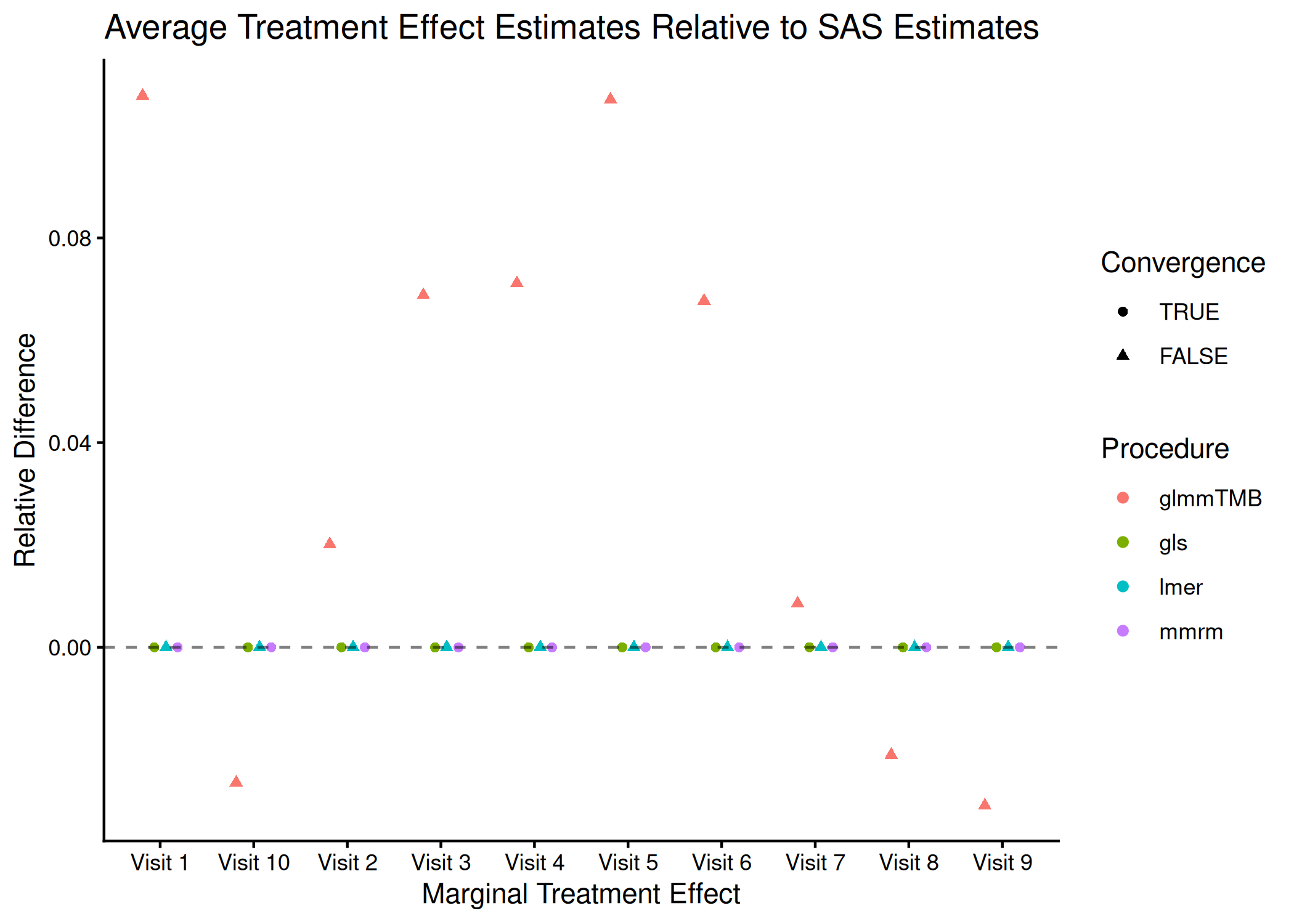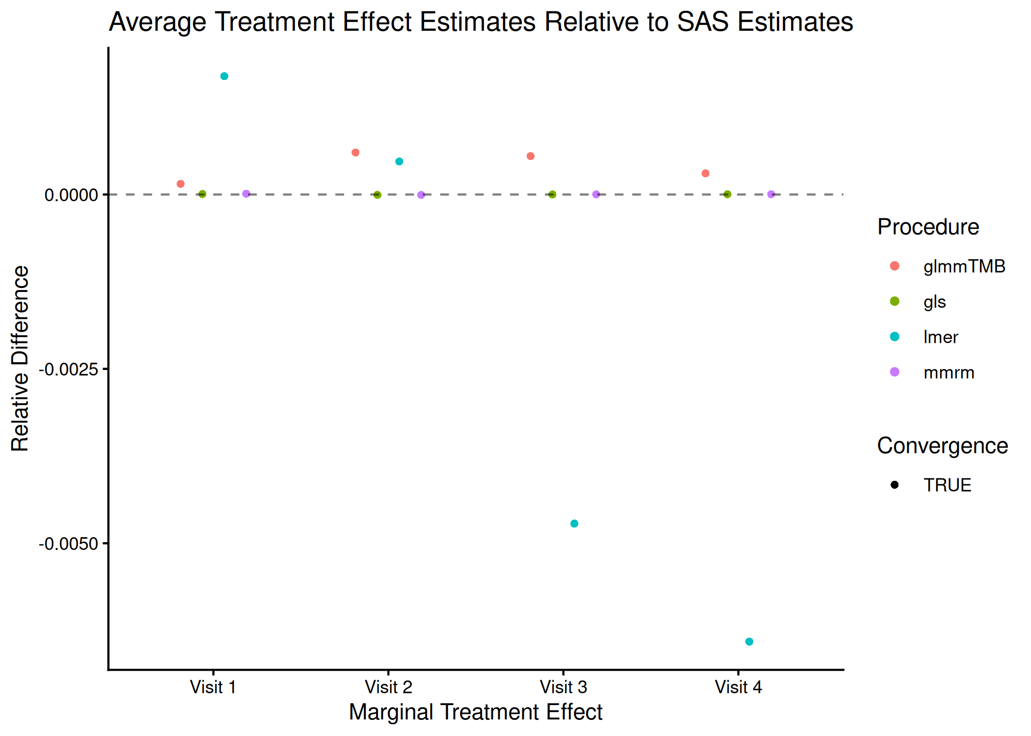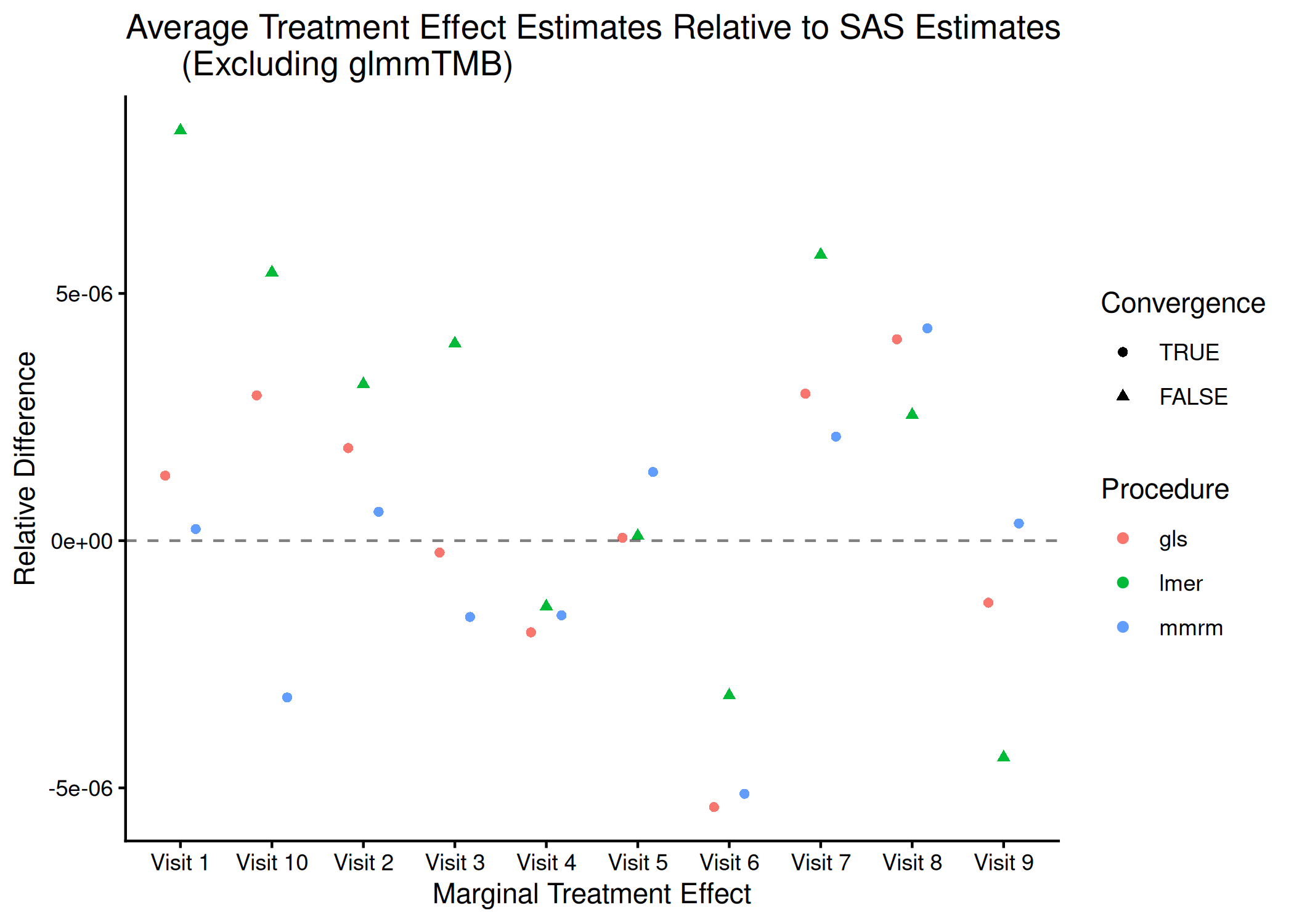 It is clear from these results that mmrm converges significantly faster than other R functions. Though not demonstrated here, this is generally true regardless of the sample size and covariance structure used. mmrm is faster than PROC GLIMMIX.