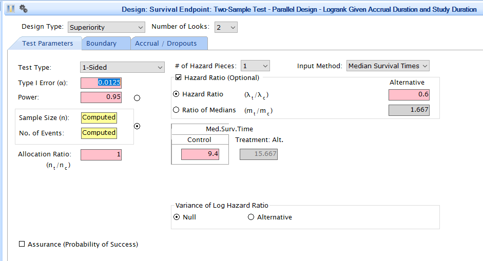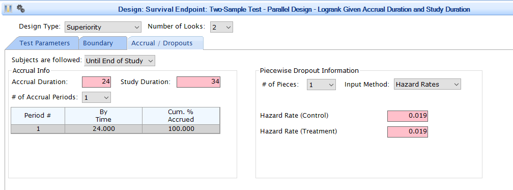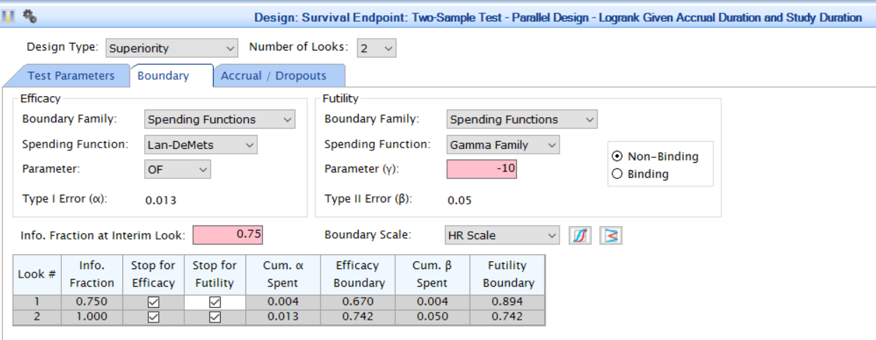 After selecting the design option, you will initially see tabs: “Test Parameters” and “Accrual/Dropouts”. Once the “Number of Looks” is updated to greater than 1, a “Boundary” tab will appear.