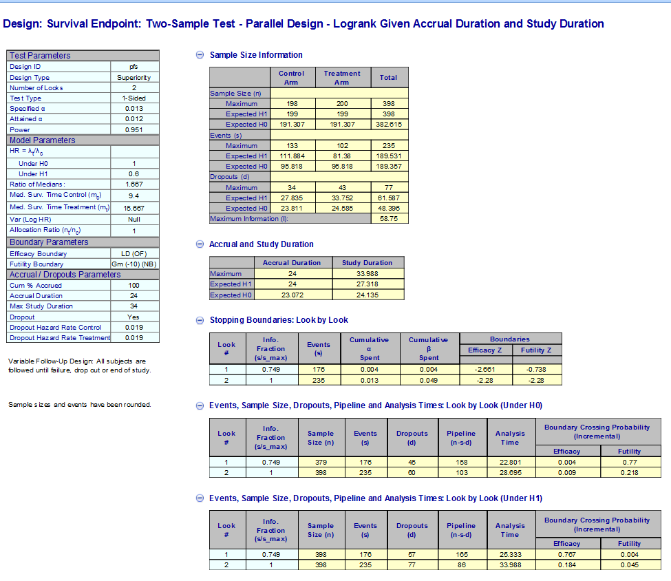Below are screenshots of each of the tabs for a group sequential design (GSD) for a progression-free survival (PFS) endpoint, which has one interim analysis for both efficacy and non-binding futility: