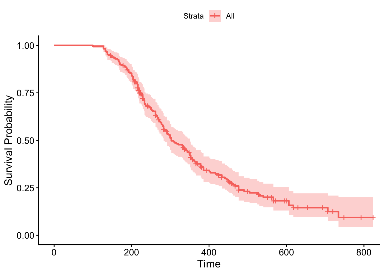 suppressPackageStartupMessages({library(survival)library(survminer)library(ggplot2)})# Fit the AFT model on the lung datasetaft_model <- survival::survreg( survival::Surv(time, status) ~ age + sex + ph.ecog,data = lung,dist ="lognormal")# Create a new data frame with predicted survival timesdf <-data.frame(time = lung$time,age = lung$age,sex = lung$sex,ph.ecog = lung$ph.ecog,status = lung$status)df$surv_times <-predict(aft_model, newdata = df)# Plot the survival curves based on the AFT modelsurvminer::ggsurvplot( survival::survfit(survival::Surv(surv_times, status) ~1, data = df),data = df,xlab ="Time",ylab ="Survival Probability")