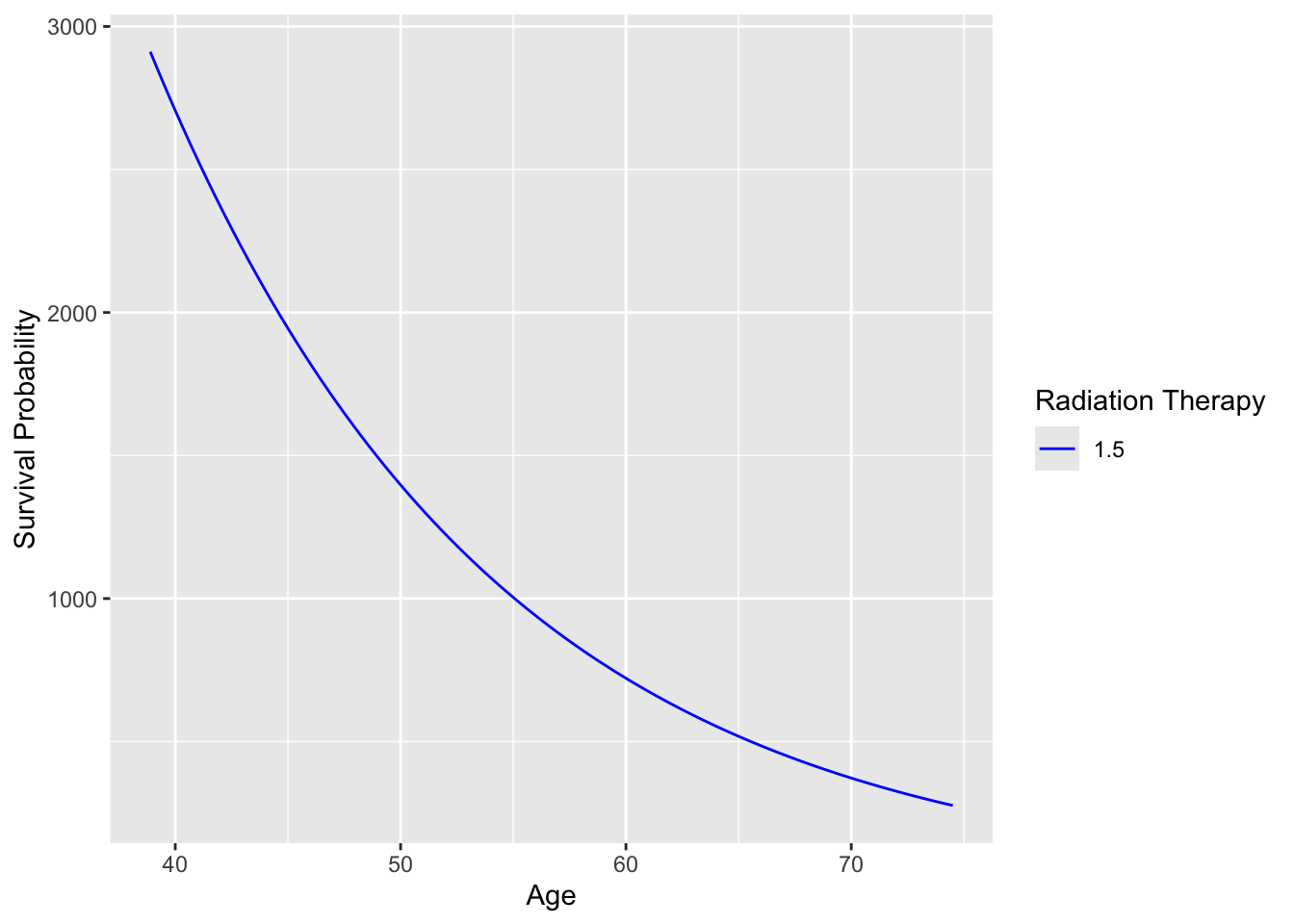 # Fit the AFT model (weibull distribution) on your datamodel_aft <- survival::survreg( survival::Surv(futime, fustat) ~ age + resid.ds + rx,data = ovarian,dist ="weibull")# Create survival curves for different levels of predictor variablesplot_data <-with( ovarian,data.frame(age =seq(min(age), max(age), length.out =100),resid.ds =mean(resid.ds),rx =mean(rx) ))# Predict survival times based on the AFT modelplot_data$survival <-predict(model_aft, newdata = plot_data)# Plot the survival curvesggplot( plot_data,aes(x = age, y = survival, color =factor(rx), linetype =factor(rx))) +geom_line() +labs(x ="Age",y ="Survival Probability",color ="Radiation Therapy",linetype ="Radiation Therapy" ) +scale_linetype_manual(values =c("solid", "dashed", "dotted")) +scale_color_manual(values =c("blue", "red", "green"))