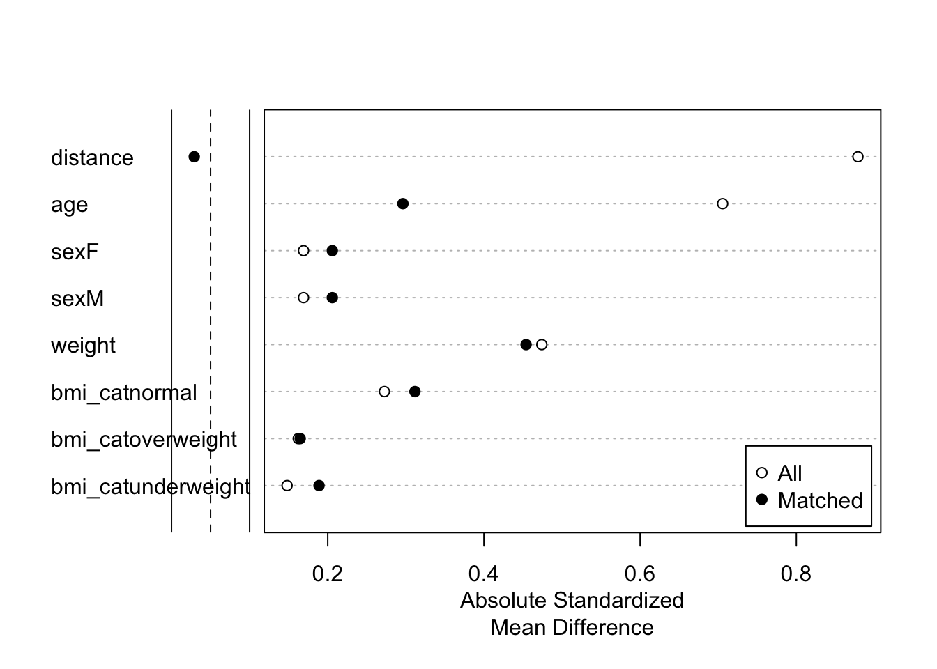 matchit(formula = trtp ~ age + sex + weight + bmi_cat, data = data,