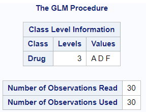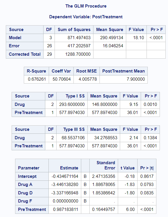As can be seen in the images above, the GLM procedure provides multiple types of analysis to determine the relationship between the dependent and independent variables. The last step produces a table of LSMEANS and coefficient of variation values for each of the three different drugs in the dataset.