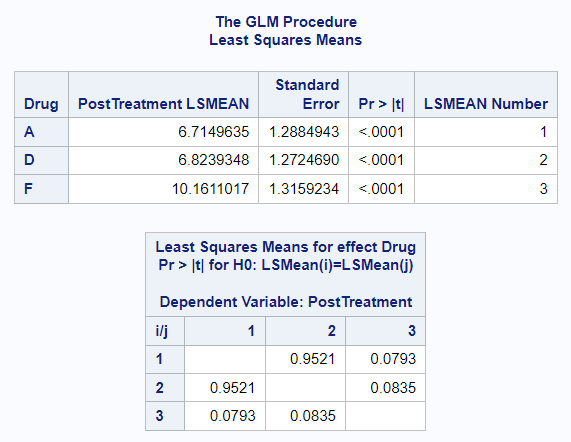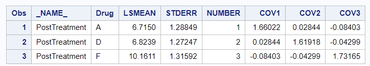 lsmeans Drug / stderr pdiff cov out=adjmeans;