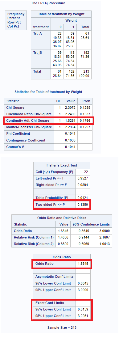 The following SAS code produces both the Chi-Square and Fisher’s Exact tests of association. Note that the results contain many statistics not produced by the corresponding R function. The relevant sections of the output have been outlined in red.
