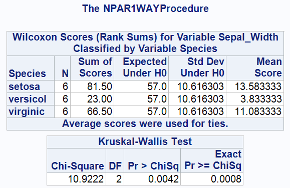 As seen above, SAS outputs a table of Wilcoxon Scores for Sepal_Width by each Species including (per group): the number (N); the sum of scores; the expected sum of scores under the null hypothesis; the standard deviation under the null hypothesis, and the observed mean score. The table also includes a footnote to specify that ties were handled by using the average score.