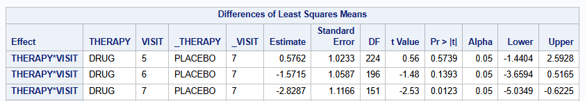 lsmeans THERAPY*VISIT / diff=control("PLACEBO" "7") cl;