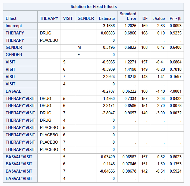 A complete case analysis is performed using mixed model for repeated measures (MMRM) with covariates: treatment [THERAPY], gender [GENDER], visit [VISIT] as factors; baseline score [BASVAL] as continuous; and visit-by-treatment [THERAPY * VISIT] interaction, and visit-by-baseline [BASVAL * VISIT] interaction. An unstructured covariance matrix is used. The MIXED procedure is used.