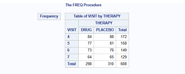 table VISIT*THERAPY / norow nocol nopercent nocum;