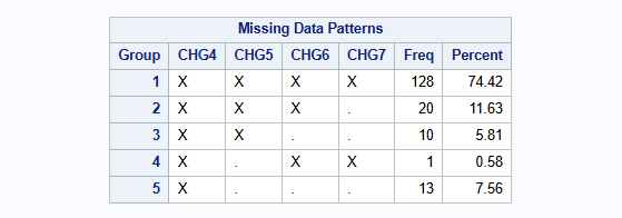 proc mi data=HAMD_wide nimpute=0 displaypattern=NOMEANS;
