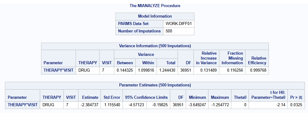 Part 3 of the 5 macros carries out a univariate ANOVA analysis at selected time points usually based on the same covariates as the parameter estimation model. It then combines the least-squares means and their differences using Rubin’s formula in a calculation similar to that in the MIANALYZE procedure to provide final results.