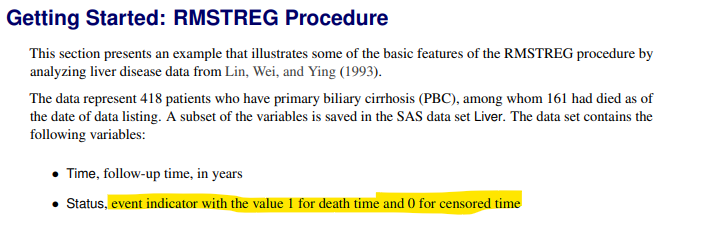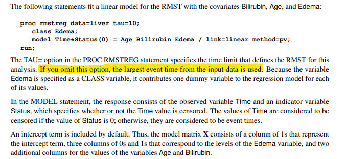 Issue 2: page 8616 of User’s Guide for RMSTREG Procedure here tells us that if we omit the option tau=xx then SAS sets tau using the largest event time. However, what SAS actually does is use the largest time from either events or censored observations.
