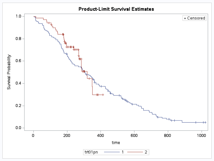 It is good practice to first view the shape of your Kaplan-Meier curves. As you can see our treatment curves are crossing at approximately 300 days.