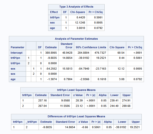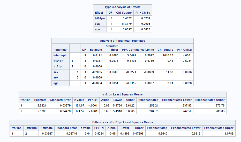 The code is similar to above. We include the option exp on the lsmeans row, since this back transforms (exponentiates) the estimates of the RMST (and 95% CI) for each treatment and for the treatment difference back onto the days scale (rather than log(days) scale). NOTE: if you use the ilink option and link=log method, this does the same (given the link is log), however, does not back transform the treatment differences. It is currently believed that SAS is using the delta method from the treatment arm RMSTs, to estimate the standard error for the RMST ratio.