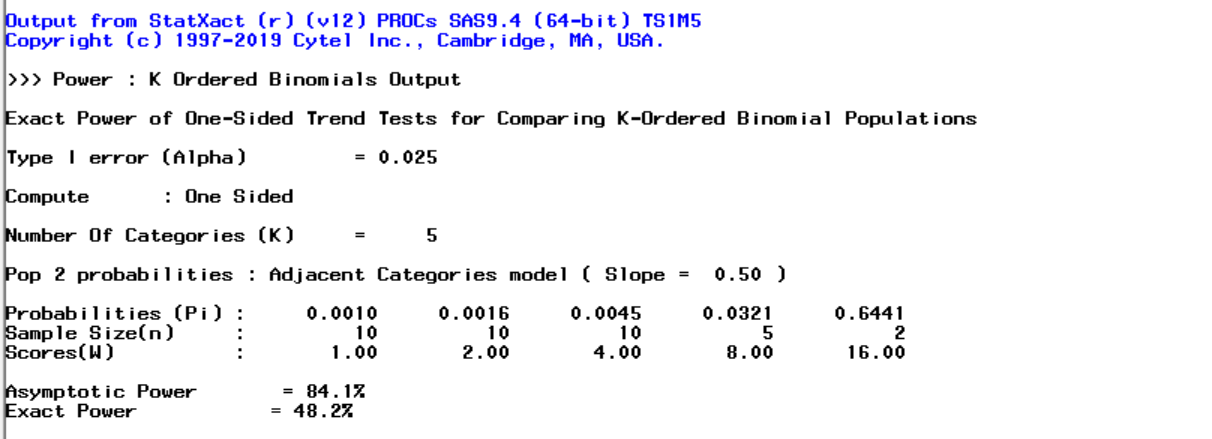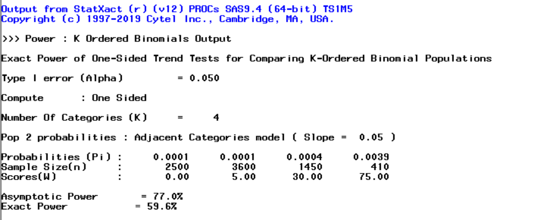 In the examples below we will calculate the extract and asymptotic powers and sample size of the Cochran-Armitage trend test. Analysis is not available in SAS and need to be run in StatXact PROC (module to SAS from Cytel).