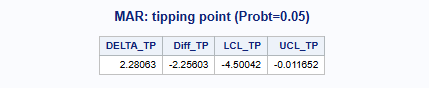 To conduct a tipping point analysis under the MAR assumption, we simply specify method = MAR under Part2A() of the five macros. Generally, the rest of Part1 and Part2 are the same as in the scenario without any delta adjustment.