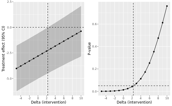 A nice visualization of this tipping point analysis for the MAR approach is shown below. The dashed horizontal line indicates a p-value of 0.05 in the left plot and no treatment effect in the right plot.