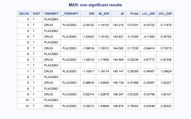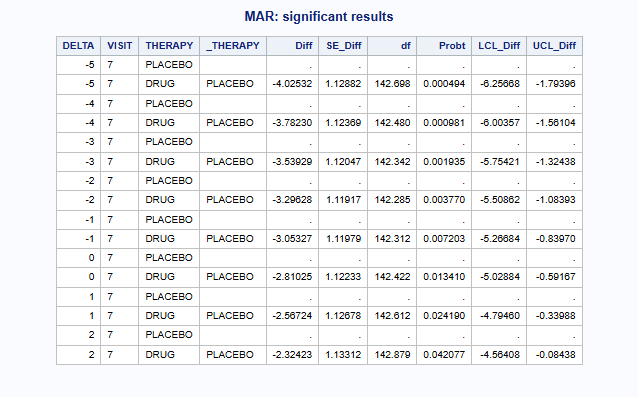 %part3(Jobname = HAMD_MAR, anref=PLACEBO, Delta = &delta &delta &delta &delta, DLag = 1 0 0 0, DGroups = DRUG, Label=MAR);