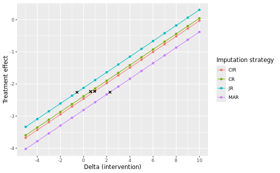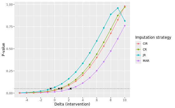 Of all considered approaches, the MAR approach yields the largest delta adjustment at its tipping point, with a delta intervention of 3 at both M = 500 and M = 5000. This indicates that the MAR assumption is the most robust against slight deviations of its conditions. Notice that for the MNAR JR approach we included, for completeness, tipping point analyses to know when the results switch from non-significant to significant. Correspondingly, two negative delta’s (-1) are found at the tipping point. This is expected, given that the original analyses are non-significant (p ~ 0.0650 and p ~ 0.0611) and a tipping point analysis here aims to find the point at which the analysis turns to be significant, instead of non-significant.