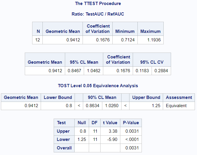 proc ttest data=auc dist=lognormal tost(0.8, 1.25);