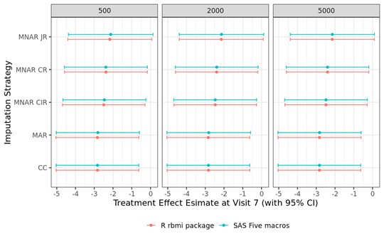 The PHUSE CAMIS project provides a detailed step-by-step overview on the implementation of reference-based multiple imputation in R rbmi and SAS five macros using an example dataset (full details here: R vs SAS Reference-Based Multiple Imputation (joint modelling): Continuous Data). A comparison of analysis results from both software revealed that results were matching completely (up to some small Monte Carlo error given the randomness in multiple imputations). Standard multiple imputation and three reference-based multiple imputation approaches (CIR, CR, JR) were compared for datasets with different numbers of imputations (i.e., 500, 2000 and 5000).The figure below compares, for an example dataset, the contrast estimates (and associated 95% confidence interval) between R and SAS.