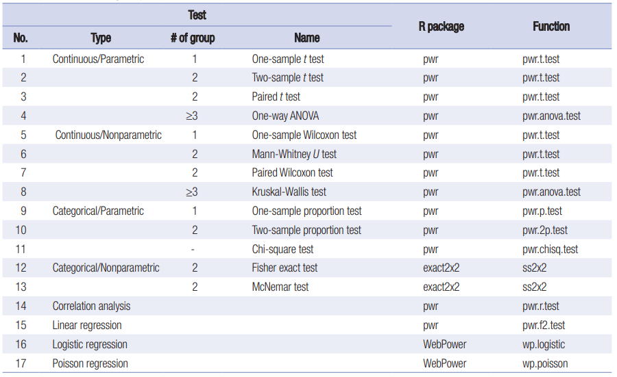 Depending on the study design and the endpoint multiple packages in R can be used. The below table [1] summarises the most popular tests and R packages where the sample size calculation is available. However, only the superiority hypothesis is considered.